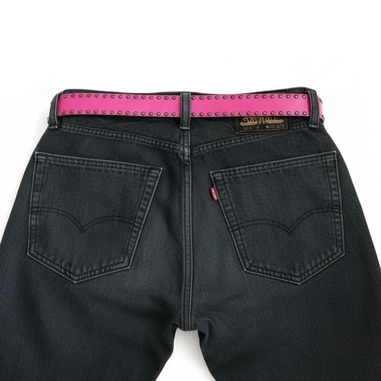 アメリカのカウボーイを彷彿とさせるシルエット。ベルト帯にはシンプルなリベット装飾が施されており、派手なピンク色のウエスタンベルト。バックル裏はドライバーとハサミを使用して長さを調節可能です。古着やストリートファッション、アメカジ、グランジ、y2k、ビンテージなどを好む方に特におすすめ。