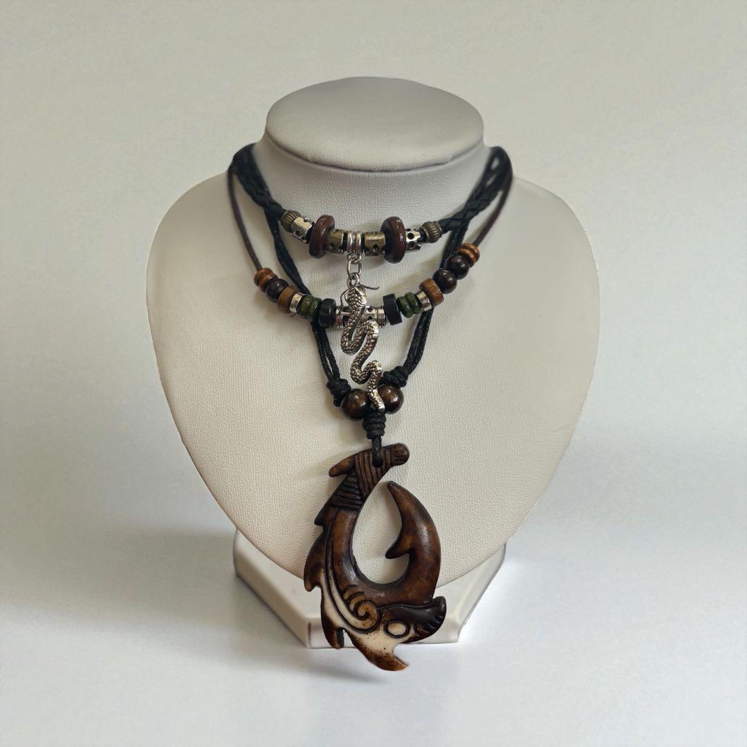 海を感じるデザインが魅力のエスニックネックス。力強いフィッシュフック型のペンダントは、神秘的な模様と素材の温もりを感じられる逸品に仕上げました。シンプルなので合わせやすく、モード、カジュアル、古着、グランジ、y2kなど様々な系統にマッチ。着用するだけで一味違う雰囲気を演出します。
