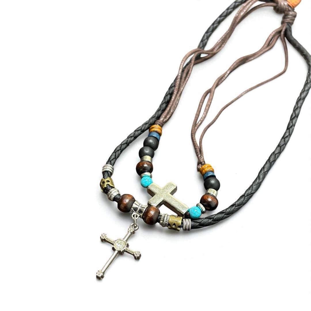 ナチュラルな素材感とクロスモチーフが融合した、個性派ネックレス。ビーズやターコイズ風ビーズをミックスし、エスニックでありながら落ち着いたカラーリングに仕上げました。シンプルなので合わせやすく、モード、カジュアル、古着、グランジ、y2kなど様々な系統にマッチ。着用するだけで一味違う雰囲気を演出します。