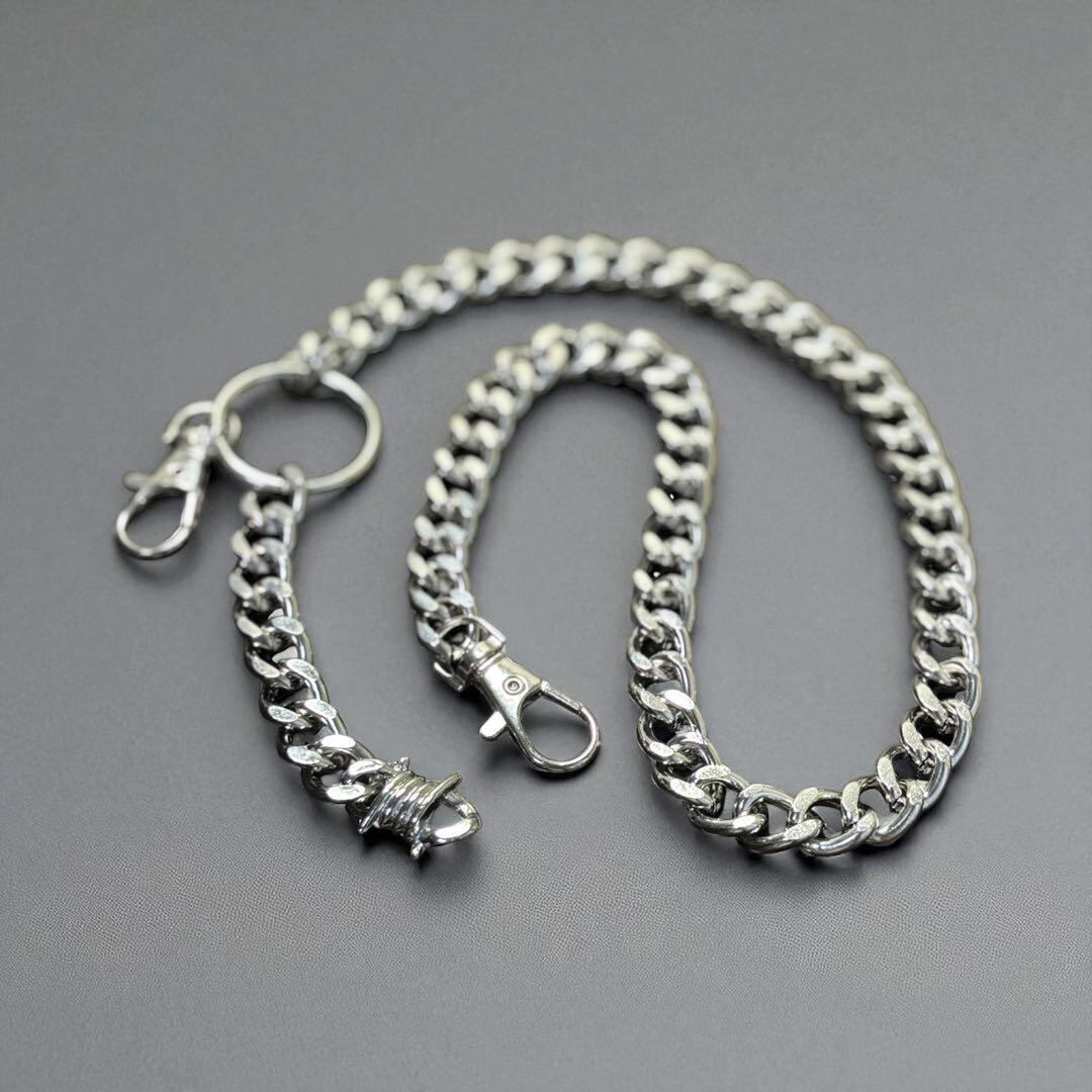 無骨さと重厚感を兼ね備えたウォレットチェーン。チェーンが存在感を放ち、腰元にアクセントを加えてくれます。シンプルながらも力強いデザインで、バイカーやストリートファッション、ロックスタイルとの相性も抜群。鍵をぶら下げる先端にはアクセントとなるデザインが施されており、財布や鍵をしっかりと固定可能。実用性とファッション性を兼ね備えたアイテムです。男らしいコーディネートに仕上げたい方、無骨でタフな雰囲気を求める方におすすめのウォレットチェーンです。