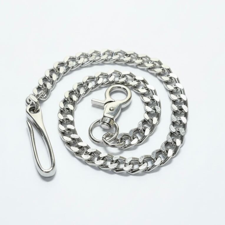 無骨さと重厚感を兼ね備えたウォレットチェーン。太めの喜平チェーンが存在感を放ち、腰元にアクセントを加えてくれます。シンプルながらも力強いデザインで、バイカーやストリートファッション、ロックスタイルとの相性も抜群。フックとキーリングが付属しており、財布や鍵をしっかりと固定可能。実用性とファッション性を兼ね備えたアイテムです。男らしいコーディネートに仕上げたい方、無骨でタフな雰囲気を求める方におすすめのウォレットチェーンです。