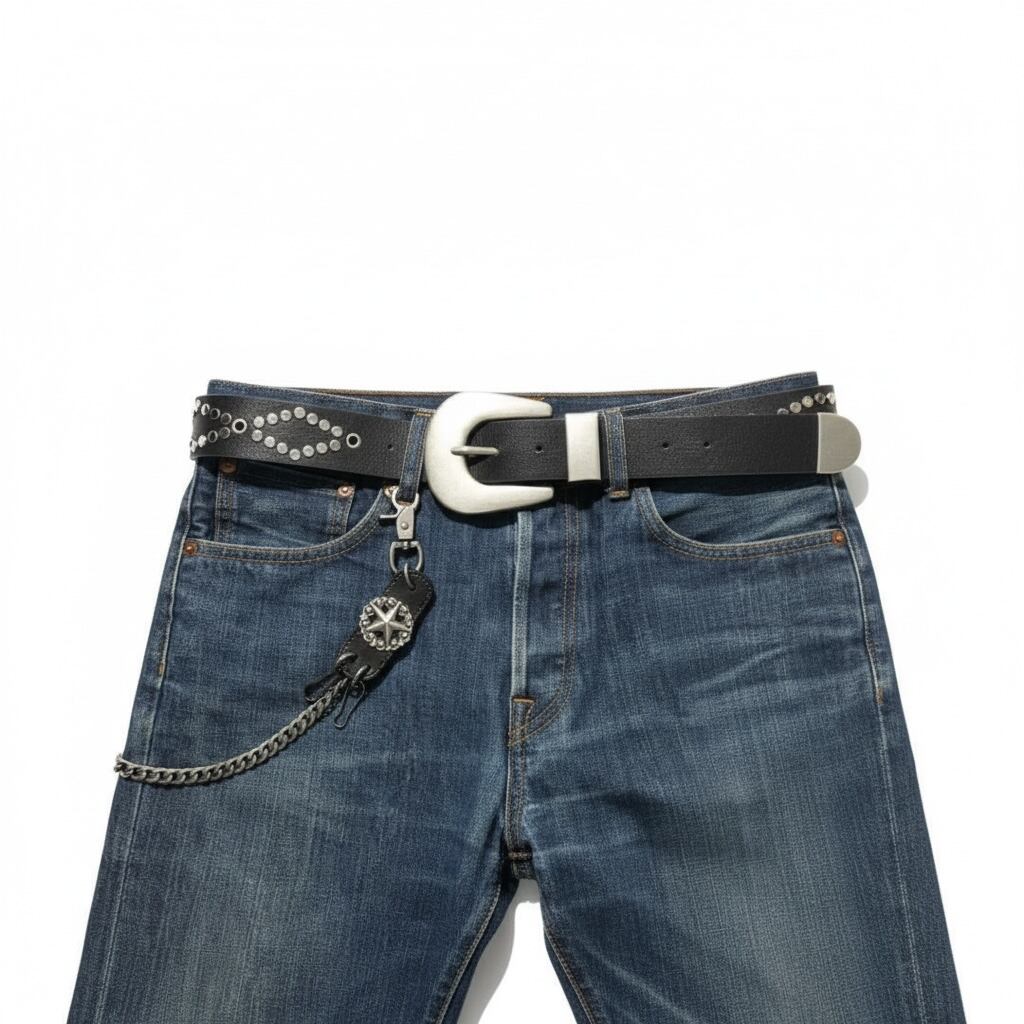 力強さと存在感を放つウォレットチェーン。重厚感のあるチェーンに、中央には星をモチーフにしたコンチョがあしらわれ、男らしさと西海岸テイストを演出しています。シルバー調の金具が無骨な印象を与えつつも、細部の装飾がスタイリングのアクセントに。ロック、バイカー、アメカジスタイルなど、個性を際立たせたい方におすすめのアイテムです。普段のデニムやレザーパンツと合わせるだけで、一気にワイルドな雰囲気を引き立てます。