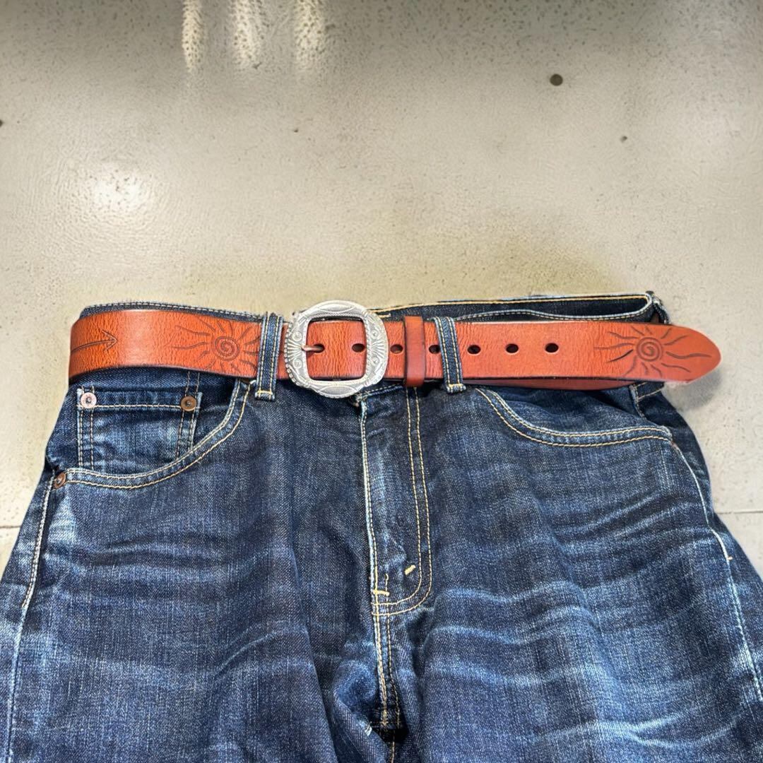 上質な牛革を使用したウエスタンスタイルのベルトです。太陽をモチーフにした型押しデザインと、彫りの深いシルバーバックルが存在感を放ちます。しっかりとした厚みと滑らかな艶感のあるレザーは、使い込むほどに深みを増し、経年変化を楽しめます。アメカジやバイカースタイル、古着コーデなど、無骨で味のあるファッションを好む方におすすめの一本です。
