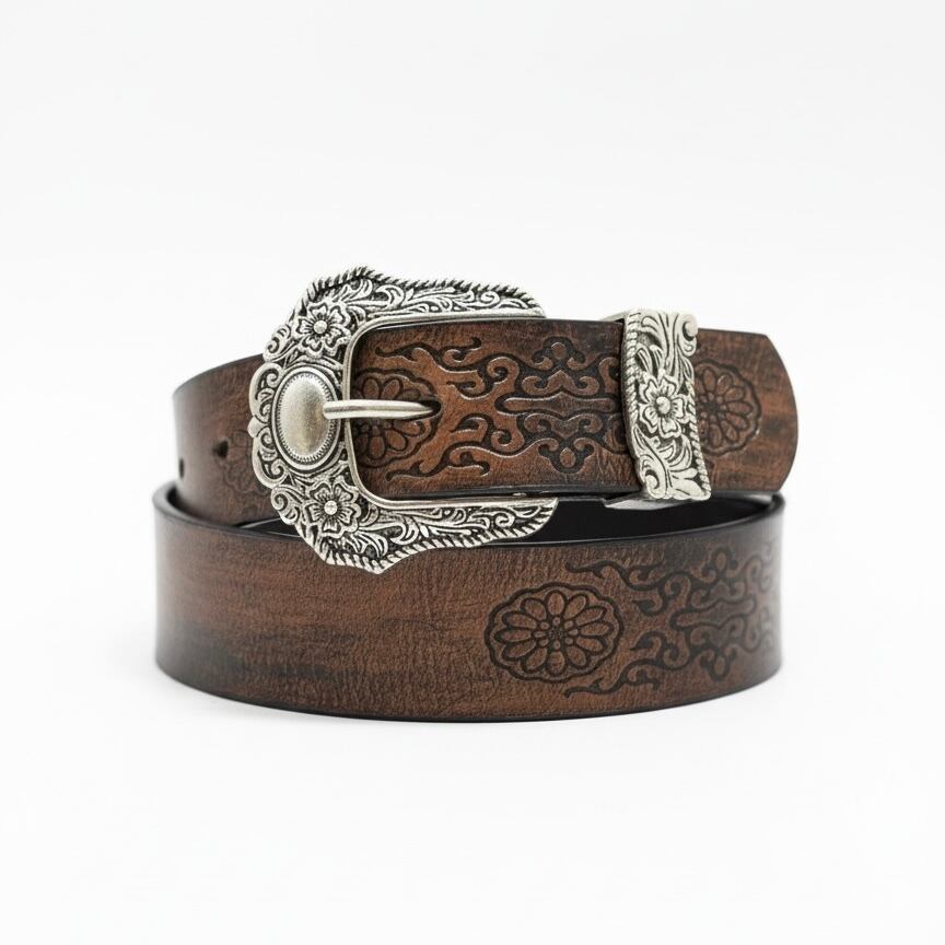 アンティーク調の装飾が映える、クラシカルな雰囲気のベルトです。バックルまわりには細かな彫り込みが施され、見た目にも重厚感があり、スタイル全体を格上げしてくれるデザインになっています。ベルト本体には花のモチーフが連続して刻まれ、さりげなく高級感を演出。落ち着いたブラウンカラーがどんなコーデにも馴染み、ウエスタン・クラシック・上品カジュアルなど幅広いスタイルにマッチします。一本あるだけで、着こなしに深みと存在感をプラスできるアイテムです。
