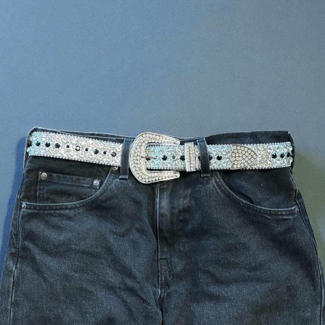 光り輝くストーンが贅沢に敷き詰められたバックルと、高級感あるストーンで装飾されているベルト帯が存在感のあるデザインのウエスタンベルト。古着やストリートファッション、アメカジ、グランジ、y2k、韓国ファッション、ビンテージなどを好む方に特におすすめ。