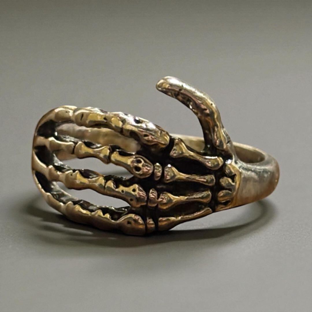 骸骨の手が指に巻きつくような、存在感抜群のリングです。関節や骨の形状が細部まで丁寧に表現されており、立体感と迫力のある仕上がりになっています。アンティーク調の風合いが、コーディネートにハードなアクセントをプラスしてくれるアイテム。ロック、パンク、ゴシック系ファッションはもちろん、シンプルなスタイルのワンポイントとしても映えるデザイン。個性的で目を引くアクセサリーを探している方に特におすすめです。
