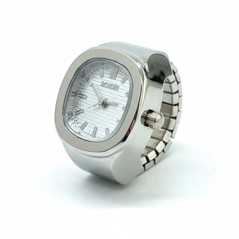指輪として身に着けながら、実際に時刻を確認できる“時計リング”です。文字盤はコンパクトながら視認性がよく、アクセサリーとしてだけでなく、しっかり腕時計としても機能する実用的なアイテムとなっています。