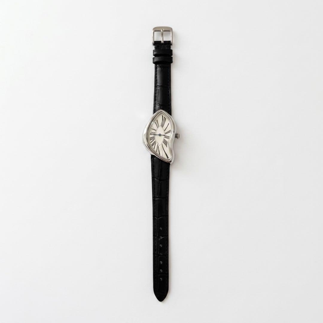 流れるように歪んだケースフォルムが目を引く、アートピースのような腕時計。一般的なラウンド型とは一線を画す有機的なシルエットが、手元に独自の存在感と個性をもたらします。